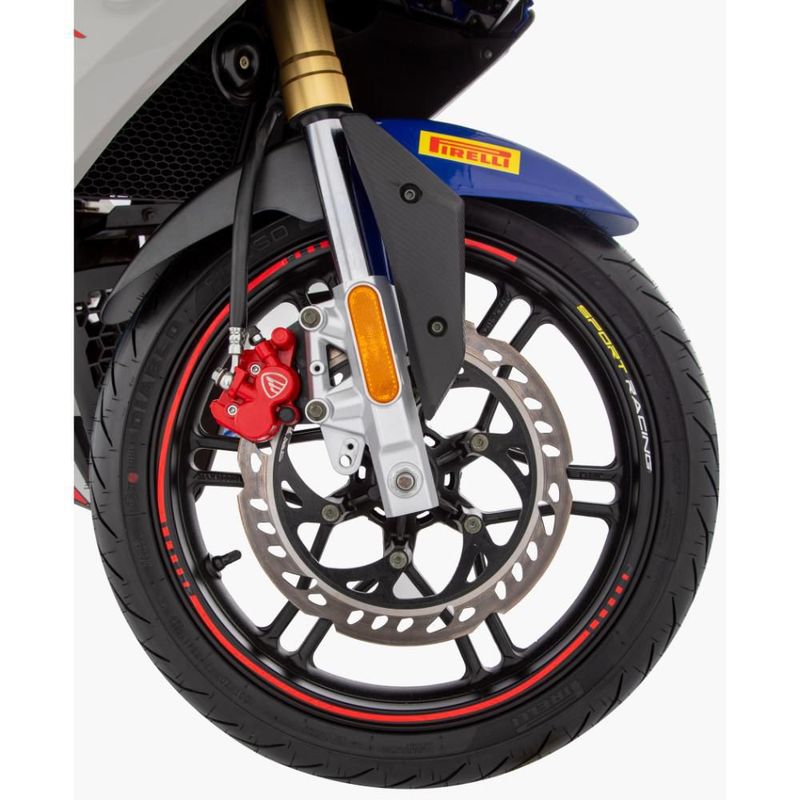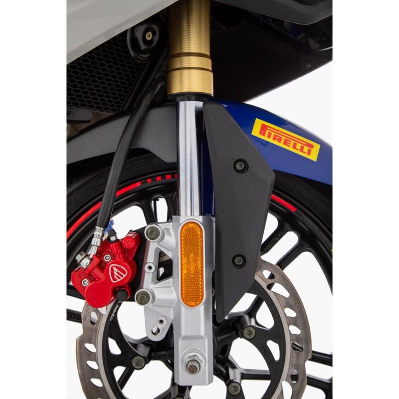 Su sistema de arranque es eléctrico muy fácil de utilizar, tiene transmisión estándar, frenos delanteros y traseros de disco sencillo. Su suspensión delantera es de horquilla telescópica y la trasera es basculante mono shock, mismas que te brindan mayor adherencia, control y confort al manejar.
